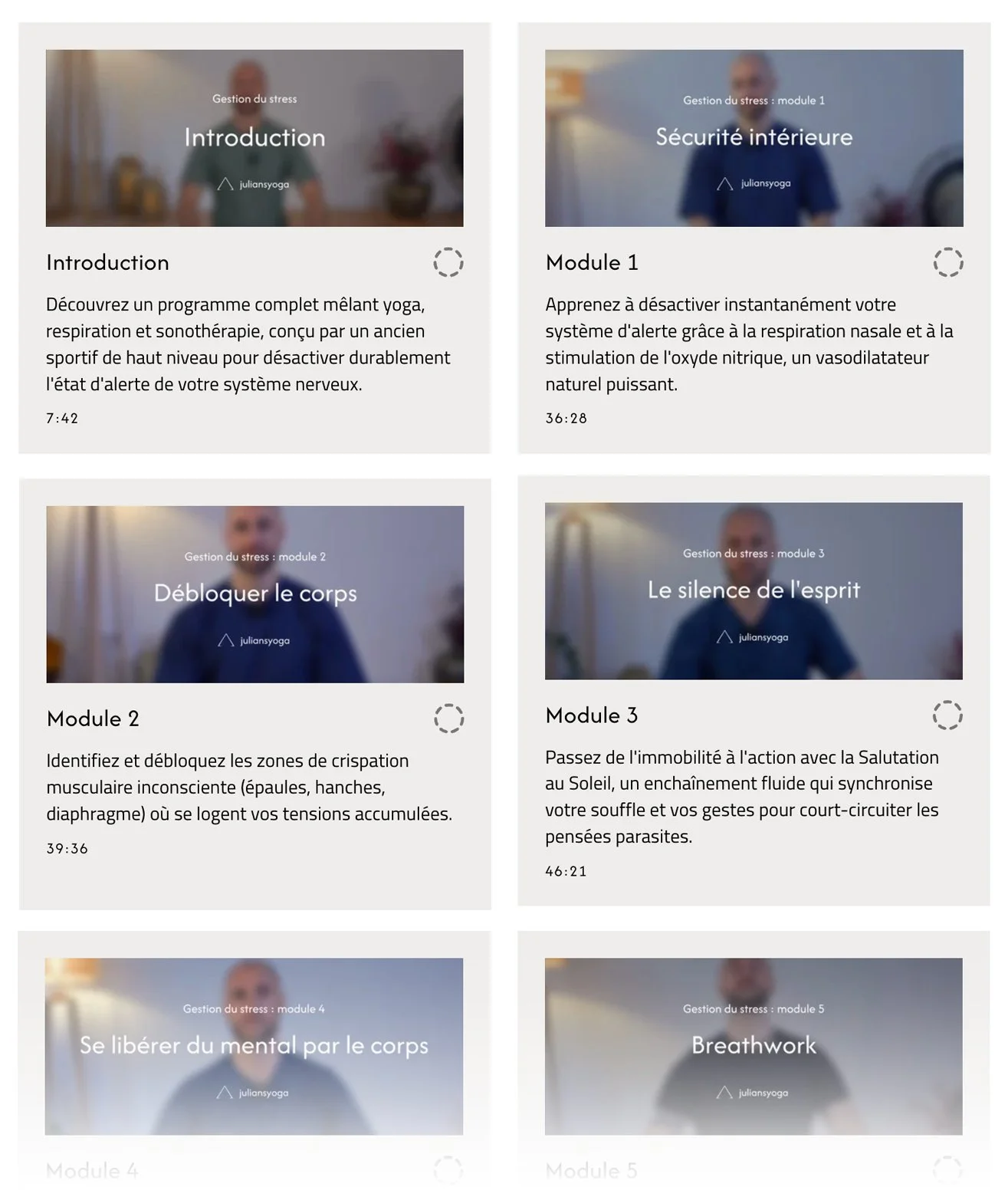Ce parcours progressif de 7 modules vous donne les clés pour désamorcer le stress en profondeur. En combinant la puissance du Breathwork, des postures de yoga ciblées et des méditations guidées, vous apprenez à calmer votre esprit et à libérer les tensions accumulées. Un rituel quotidien de 45 minutes pour passer de l'état de survie à un état de calme durable.